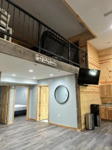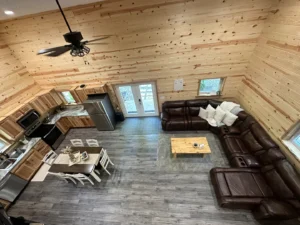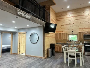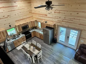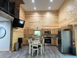 The Cabin Cove has 4 bedrooms 3 queen beds and 2 bunk beds. 2 full bathrooms and a washer and dryer. The living is big and spacious and joins with the kitchen. There is a second small living up stairs as well.